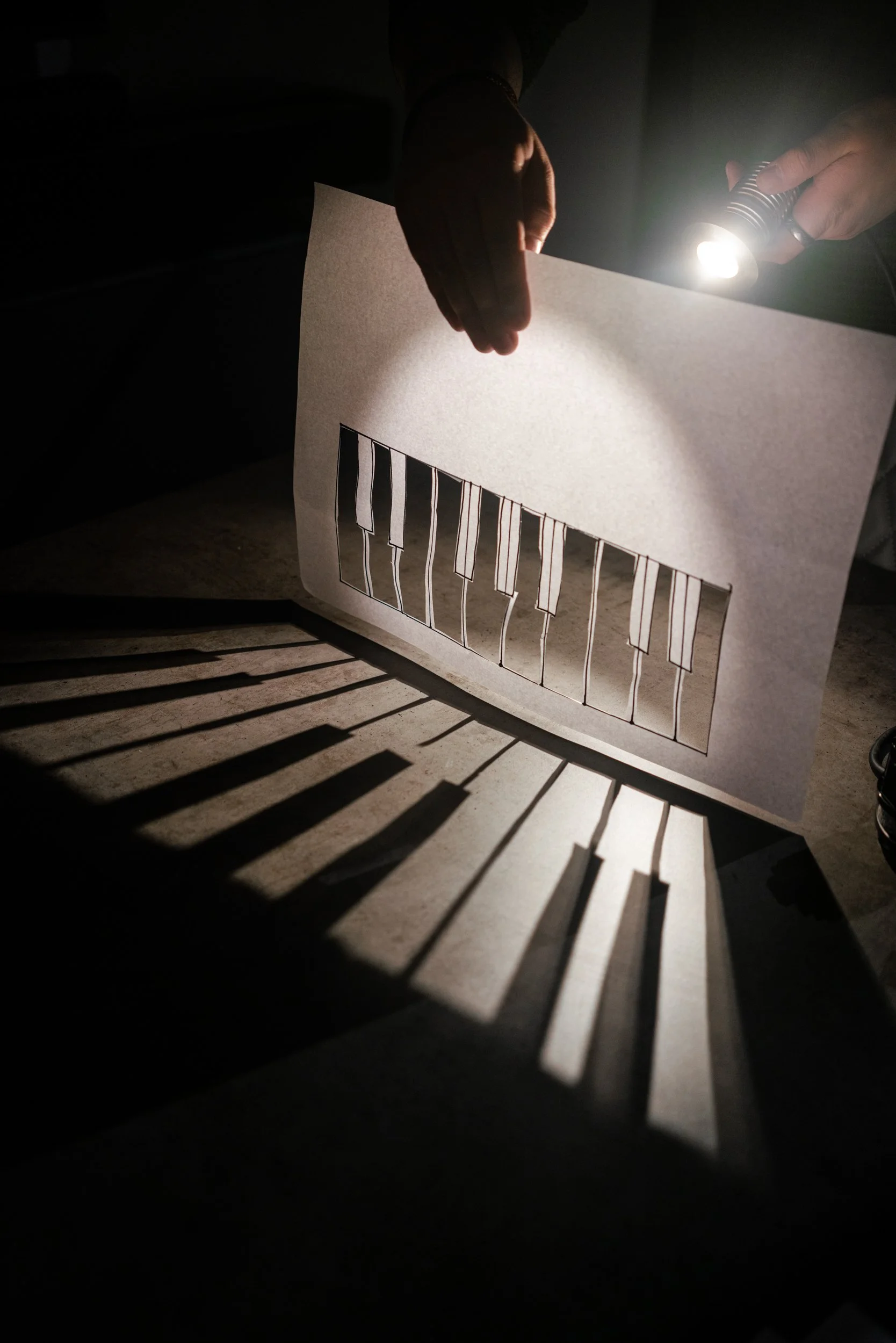 An experiment to use a sticker placed on the bottom of a piano shop window where a light would be used to cast a keyboard patten onto the pavement outside.